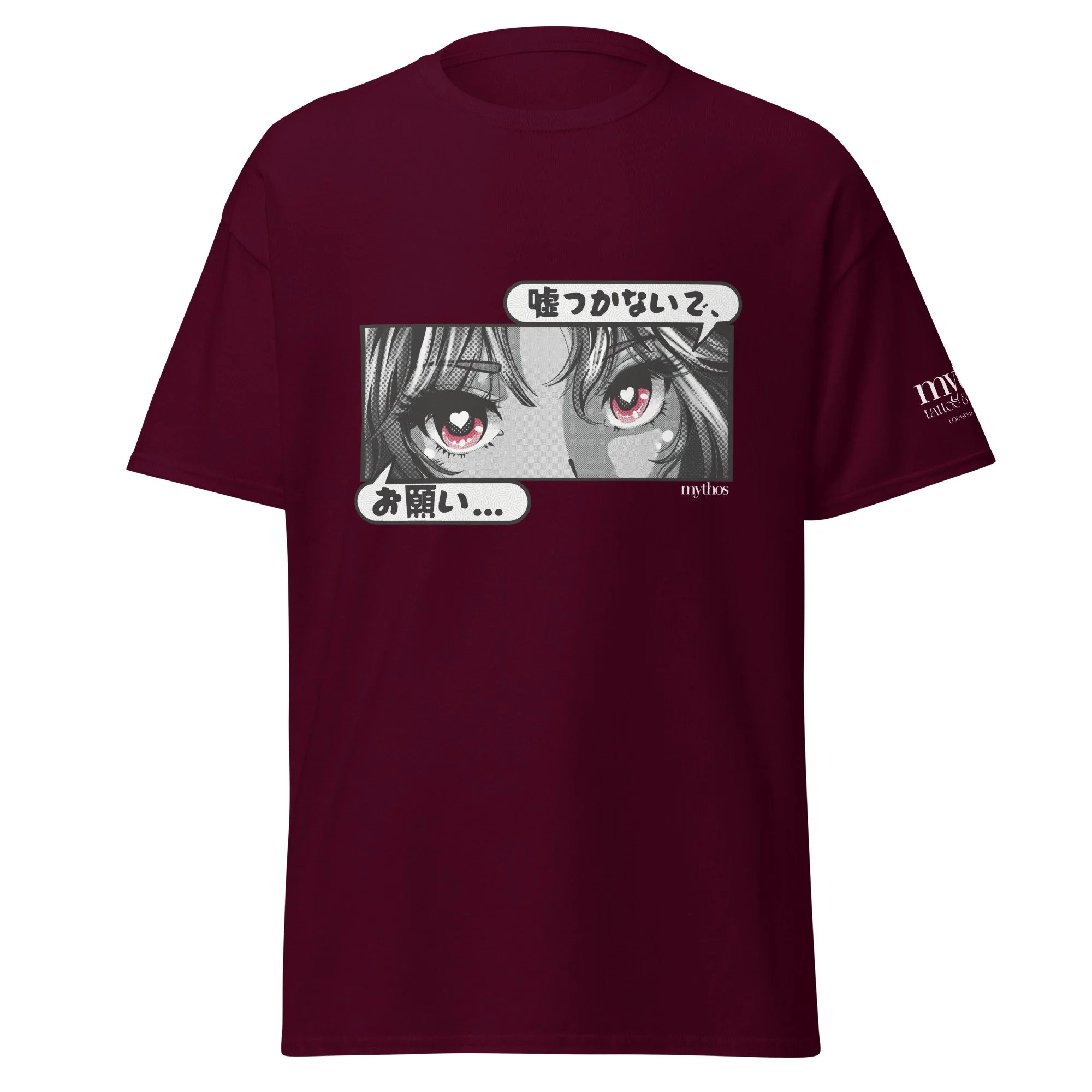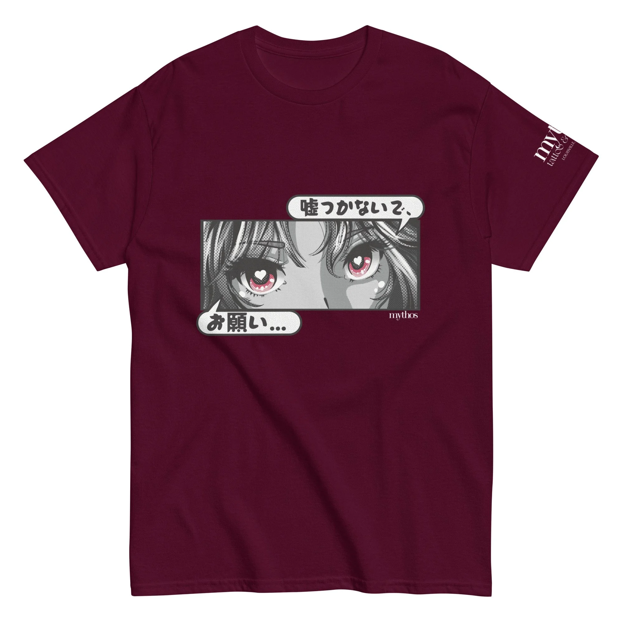 Manga panel style tee that reads “Don’t lie to me, please,” or “嘘 お つかない で , お願い” (or “uso o tsukanai de, onegai”) designed by Alexis Muñiz @tattoosbyalexis at Mythos.